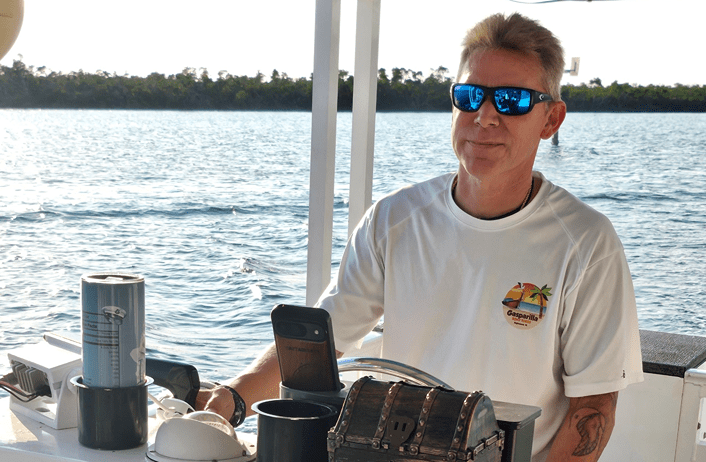 Captain Jeremy may have started as a farm boy from Ohio, but once he discovered Lemon Bay, the sea stole his heart for good. Before becoming a full-time captain, he lived a life full of stories—working as a DJ, Corrections Officer, Private Security professional, Magician’s assistant, bartender, sous chef, and manager. These days he trades tractors for tides and morning chores for dolphin sightings, sharing the water with the same humor and warmth he brings to his own family. Now married with two teenage daughters and a grown son living in Chicago, Captain Jeremy loves creating unforgettable memories on the bay for others just like he does with his own crew. Every Gasparilla tour comes with a smile, a story, and the easygoing spirit of someone who truly loves the life he’s built on Lemon Bay.